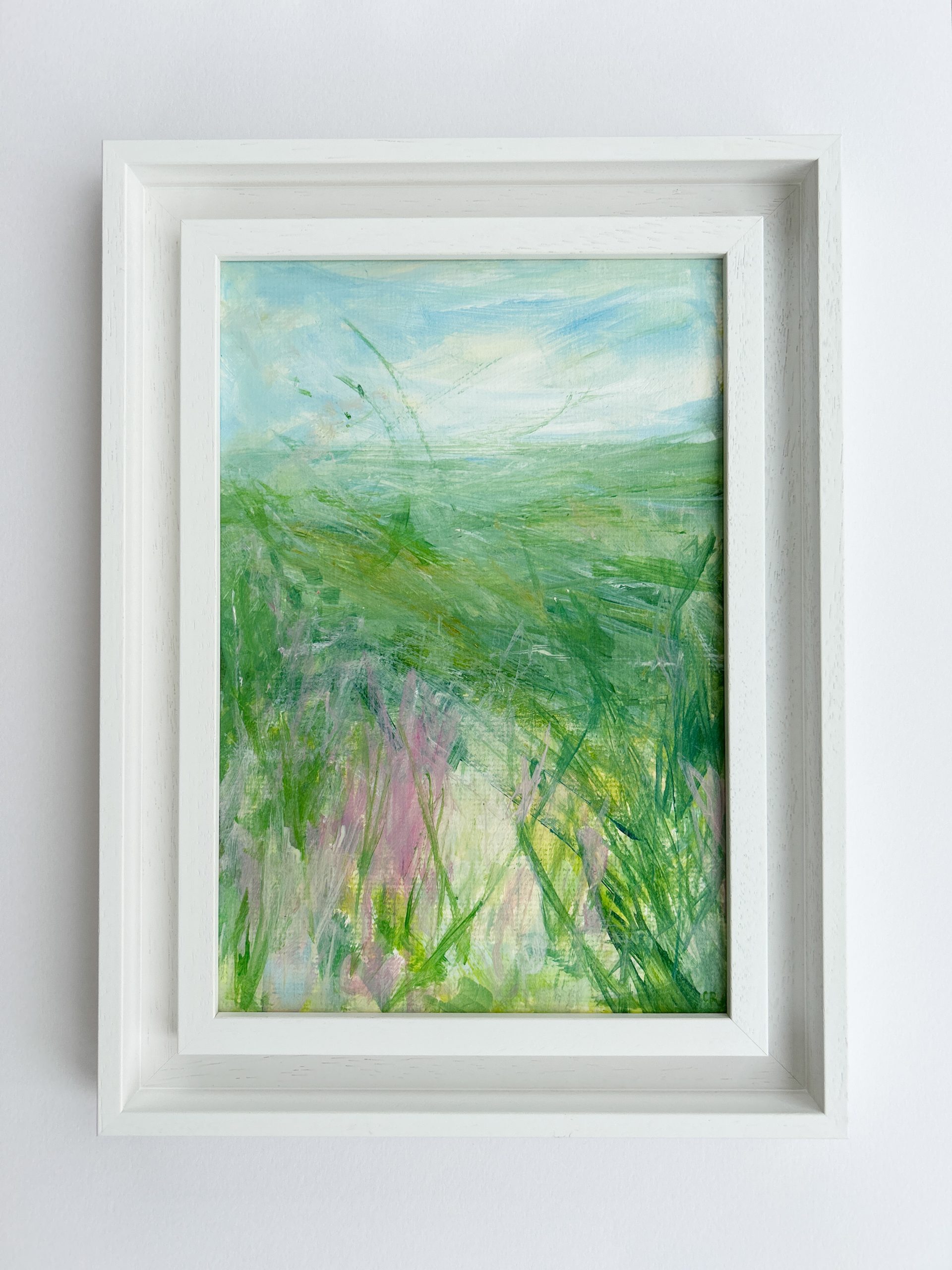 It’s Breezy Up Here uses expressive mark making to evoke the freedom of standing high up in the landscape, where the wind carries both calm and possibility. This piece brings an uplifting, airy energy.