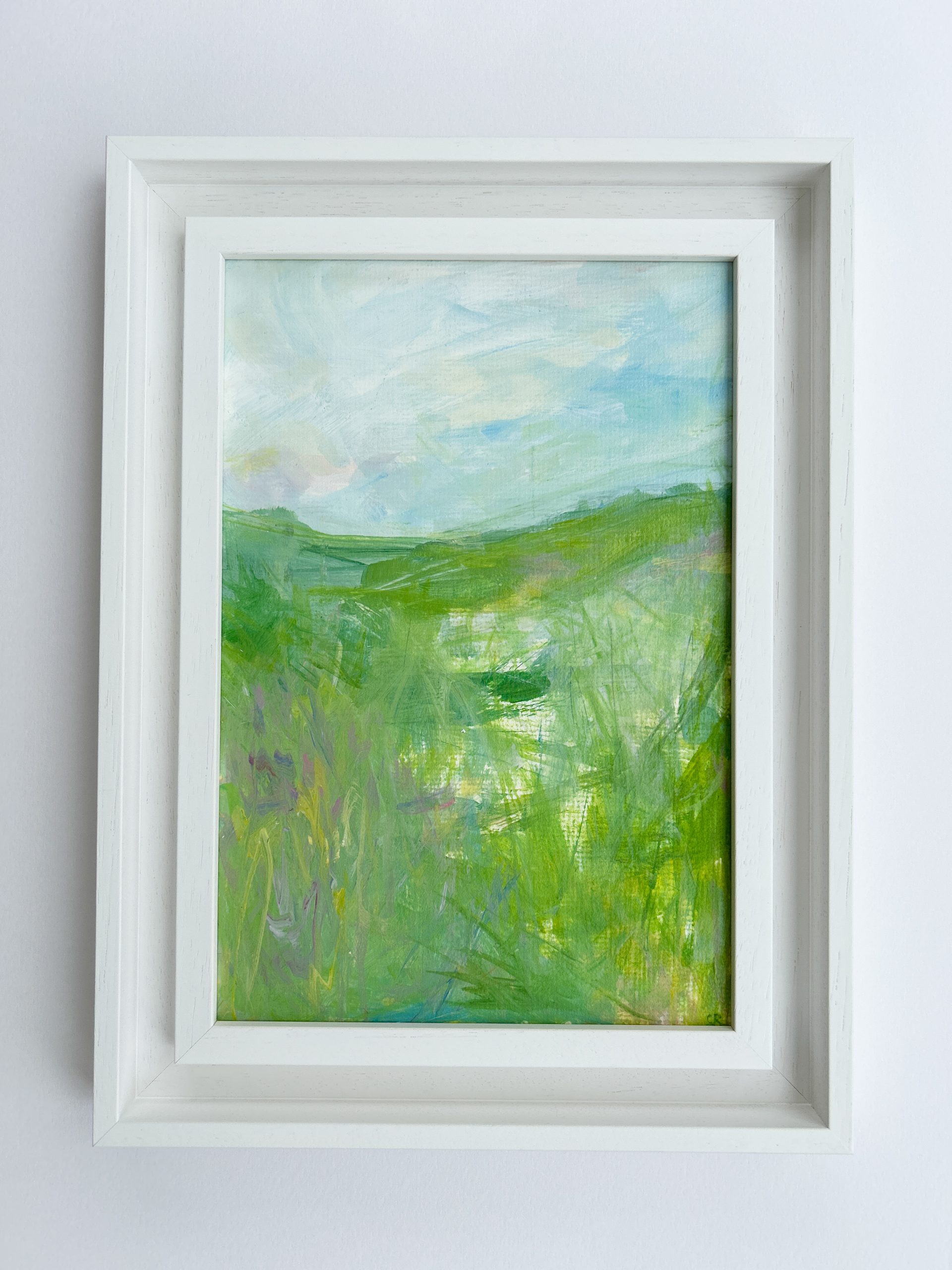 A continuation of the journey explored in Just Over the Next Hill, It’s Breezy Up Here, and You Can See the Sea From Here, this original painting captures that moment when you pause and see a familiar point in the landscape ahead and know that you’re nearly there.