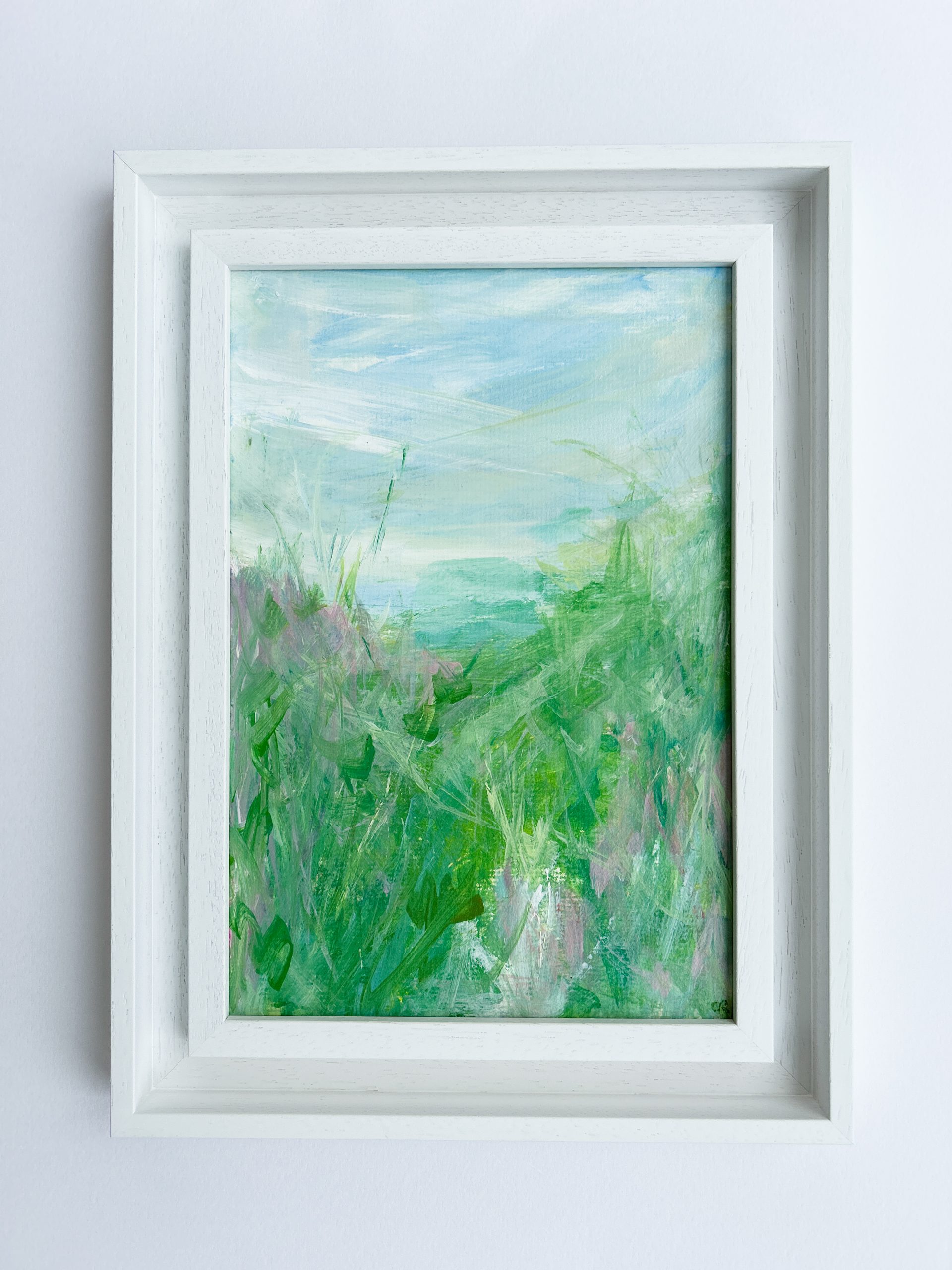 This original painting captures the quiet wonder of reaching a height where the sea first comes into view.